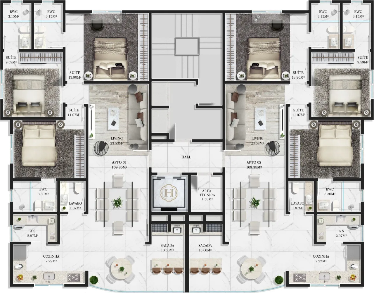 De acordo com a lei 4591/64, informamos que as imagens e ilustrações contidas neste material possuem caráter exclusivamente promocional. Os imóveis, assim como alguns materiais de acabamento representados nas ilustrações e plantas, não fazem parte do contrato. O apartamento será entregue conforme indicado no memorial descritivo, podendo haver modificações em função de projeto estrutural sem aviso prévio.